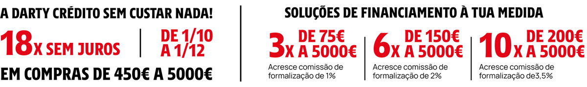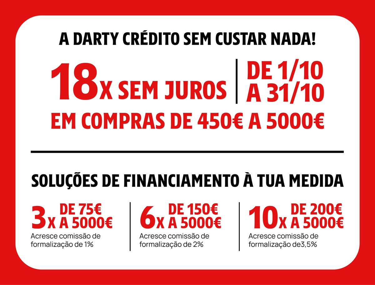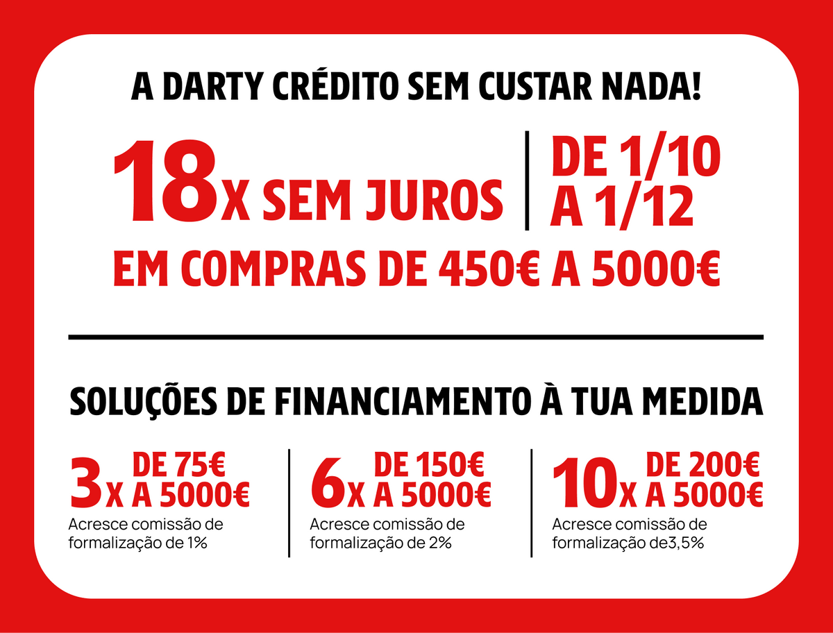 Em todas as compras na opção de reembolso pagamento mínimo. Desconto creditado no cartão, reutilizável numa loja Darty limite anual 160€, validade 2 anos, não se aplica em caso de incumprimento.