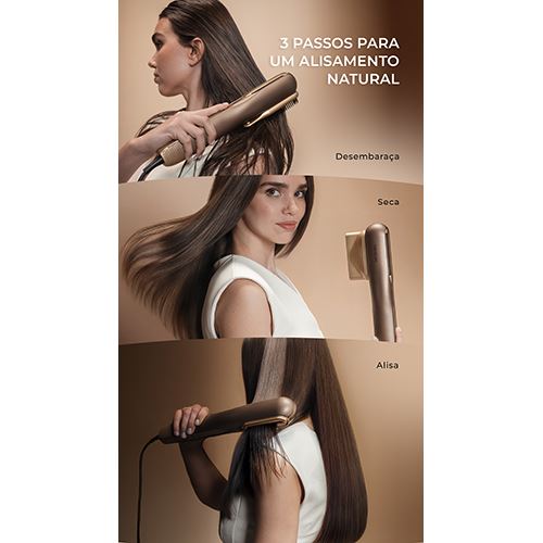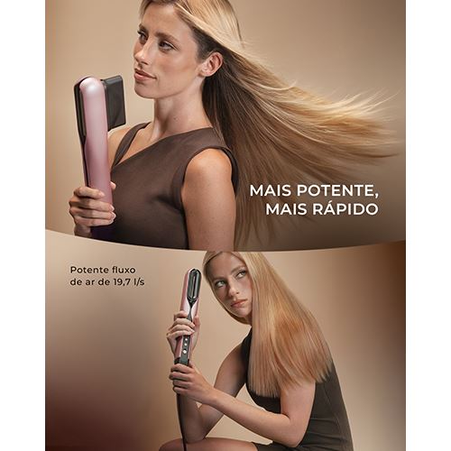 Caudal de ar potente de 19,7 l/s | Motor Brushless de alta eficiência 112.000 rpm | Sensor inteligente detecta o contacto das placas com o cabelo | Ar frio | Revestimento de cerâmica com queratina