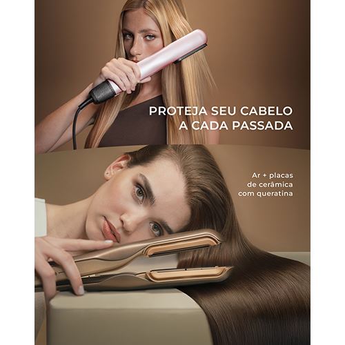 A tecnologia Plasma neutraliza a eletricidade estática, reduzindo o frizz e deixando o cabelo sedoso e maleável. As placas com revestimento cerâmico e queratina garantem um deslizamento suave, protegendo a fibra capilar. Com 4 temperaturas e 2 velocidades, adapta-se a todos os tipos de cabelo, incluindo os mais espessos e encaracolados. Inclui cabeças magnetizadas para alternar entre escova e concentrador, oferecendo versatilidade total.