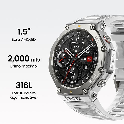 Construído para resistir a temperaturas extremas de até 70 ?, frio intenso de -30 ? e mergulhos até 100 metros de profundidade. A sua estrutura de grau militar e o aro em aço inoxidável fazem do Amazfit T-Rex 3 o teu companheiro ideal para qualquer desafio.
