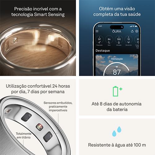 Insights personalizados de saúde | Laboratórios Oura | Sessões guiadas para meditação, sono e muito mais | Relatórios semanais, mensais, sazonais, anuais (Resumo do ano) e de aniversário | Integração com aplicações de saúde e bem-estar de terceiros, como Apple Health, Health Connect da Android e Strava