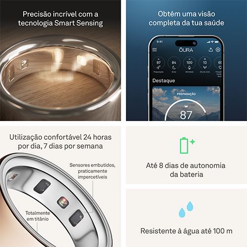 Insights personalizados de saúde | Laboratórios Oura | Sessões guiadas para meditação, sono e muito mais | Relatórios semanais, mensais, sazonais, anuais (Resumo do ano) e de aniversário | Integração com aplicações de saúde e bem-estar de terceiros, como Apple Health, Health Connect da Android e Strava
