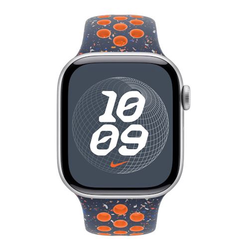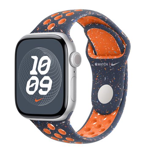 Fabricada em fluoroelastómero especial de alto desempenho com perfurações moldadas por compressão para aumentar a respirabilidade, a Bracelete desportiva Nike é resistente, durável e surpreendentemente macia. Inclui flocos coloridos que formam padrões aleatórios e tornam cada peça num exemplar único. Um material suave e resistente que envolve o pulso com elegância e é agradável ao toque. E um novo fecho de clip em alumínio com acabamento mate.