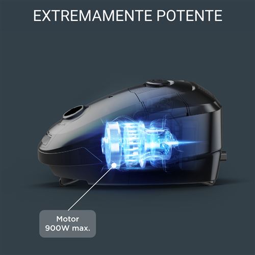 Se procura um aspirador potente com aspiração efciente, o aspirador Power XXL é a solução! Oferece ótimos resultados de aspiração com um motor de 900 W com baixo consumo de energia (De acordo com (EU) N°666/2013) e 2 níveis de filtragem (99,98% de filtragem) para um ar puro. Este aspirador é o seu melhor aliado para sessões de limpeza longas, graças ao raio de ação de 8.80 m e depósito de pó XXL (4,5 L). O aspirador Power XXL garante máxima autonomia e conveniência.
