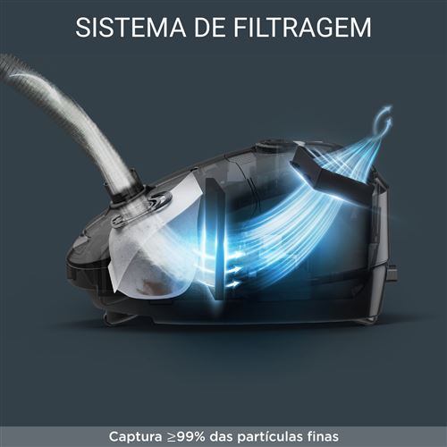 2 níveis de filtragem que capturam mais de 99,98% das partículas finas para um ar mais puro (Filtro de espuma e saco Hygiene+)