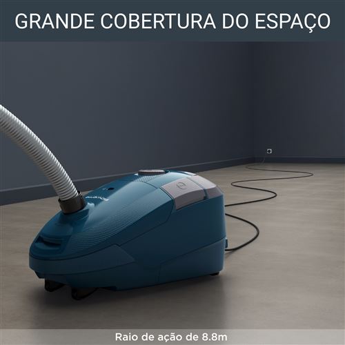 Raio de ação de 8,80 m | Totalmente higiénico | Sacos Hygiene+ | Número de sacos: 1 | Pega clássica de transporte | Performance de limpeza XXL | Indicador de saco cheio | Fácil manuseamento 4 x 360º rodas | Posição de descanso 2