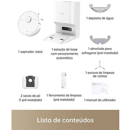 1x Saco de pó | 1x Robot | 1x Escova principal | 1x Depósito de pó | 1x Estação de carregamento | 1x Escova de limpeza | 1x Mopa | 1x Depósito de água | 1x Escova lateral | 1x cabo de alimentação