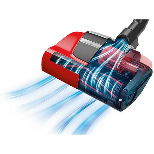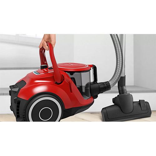 Visualmente, o aspirador distingue-se pelo seu elegante acabamento em vermelho e preto, conferindo um toque moderno ao equipamento. Não se trata apenas de beleza, mas também de substância. O controlo eletrónico da potência, feito através de um botão rotativo, permite ajustes fáceis conforme necessário, seja numa sujidade mais resistente ou numa manutenção rotineira rápida. Para garantir que o desempenho nunca diminui, o SmartSensor Control monitoriza continuamente o funcionamento do aspirador, ajustando automaticamente os parâmetros para uma eficácia incomparável.