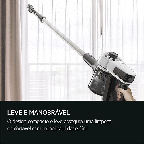 Com apenas 2,18 kg, este modelo é leve e ergonómico, permitindo alcançar zonas elevadas, cantos e áreas de difícil acesso. Inclui escova 2 em 1 e bocal para móveis, e pode ser armazenado facilmente com suporte de parede.