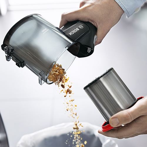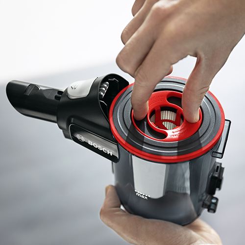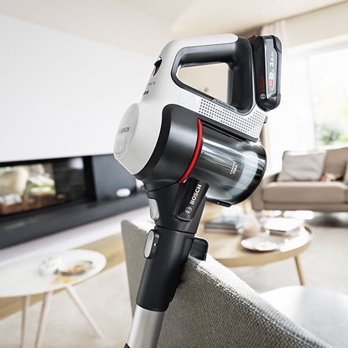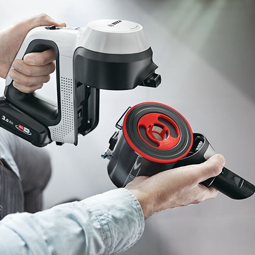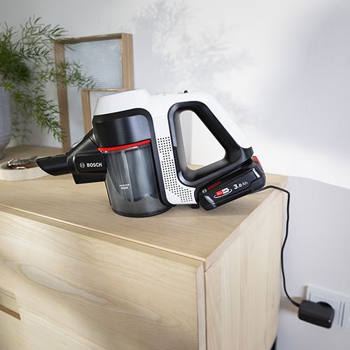 Este aspirador vertical revela-se um aliado poderoso graças à sua autonomia que permite até 40 minutos de uso contínuo. Isto resulta em sessões de limpeza ininterruptas, ideais para enfrentar as exigências de grandes áreas sem a preocupação de recarregar frequentemente. Equipado com uma bateria amovível Bosch de 3,0 Ah, oferece a flexibilidade de ser utilizado com outros aparelhos Bosch, maximizando o uso em diferentes tarefas dentro do lar.