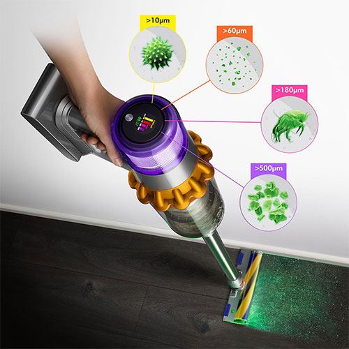 Filtragem completamente estanque da Dyson retém 99,99% das partículas microscópicas e dos alergénios até 0,3 mícrones | Filamentos de fibra de carbono
