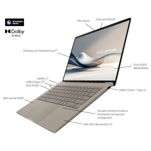A conectividade é uma prioridade neste Asus Zenbook, com interfaces versáteis incluindo USB 3.2, USB-C 4.0, HDMI e Jack 3,5mm. Além disso, a integração de Wi-Fi e Bluetooth assegura ligações rápidas e estáveis, seja para transferir dados ou conectar dispositivos sem fios. Outro destaque é a câmara FHD 1080p, perfeita para videochamadas nítidas e claras, essencial nos dias de hoje.