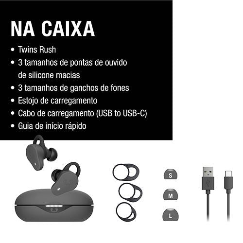 Twins Rush | Caixa de carregamento | Cabo de carregamento (USB-C para USB-C) | Bolsa de transporte em microfibra | 3 tamanhos de adaptadores auriculares de silicone macio | 3 tamanhos de arcos macios | 3 tamanhos de arcos macios | Guia rápido