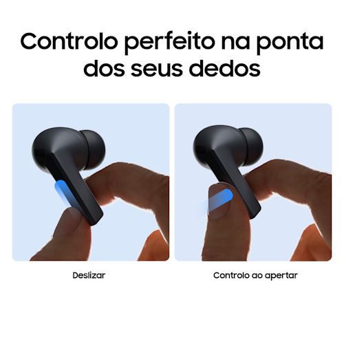 Desfrute de um controlo mais intuitivo graças aos gestos de beliscar e deslizar Isto permite lhe gerir funções essenciais, como ajustar o volume, atender chamadas ou pausar a música de forma rápida e confortável Ajuste Confortável.