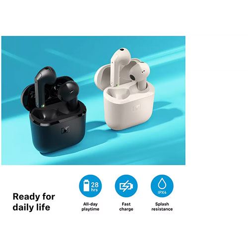 IPx4, resistência a salpicos (somente auriculares) | Sintonização de som Sennheiser | Design aberto para melhorar a perceção | Até 28 horas de tempo de reprodução proporcionadas pela bateria | Fácil de utilizar, sem esforço | Ajuste respirável e conforto leve