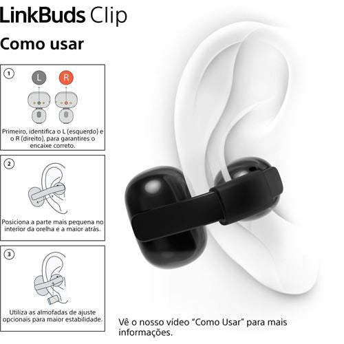 Fixação clip-on | Inclui almofadas de ajuste para orelhas pequenas | Estrutura desenhada para reduzir a fuga de som