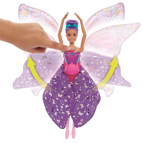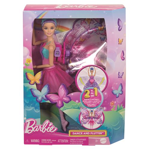 Inspira a imaginação para voar com a boneca Barbie Dança e Flutua e uma transformação mágica 2 em 1! Basta pressionar o colar no corpete da boneca e ver a saia roxa desenrolar-se magicamente para se transformar em grandes asas de borboleta cintilantes. É um momento deslumbrante que as crianças vão adorar ativar vezes sem conta. O encantador coque roxo com fita para a cabeça floral, corpete deslumbrante e sapatilhas de ballet completam o visual lindo.