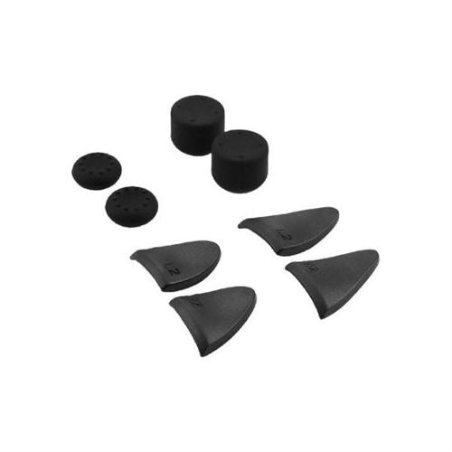 4 Extensores de gatilho (2 CURTOS + 2 LONGOS) para estender a superfície dos gatilhos L2 / R2 e melhorar sua pulsação | 4 Alças de silicone para joystick (2 LOW + 2 HIGH) para diferentes combinações dependendo do jogo usado