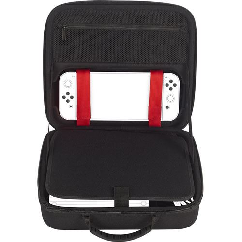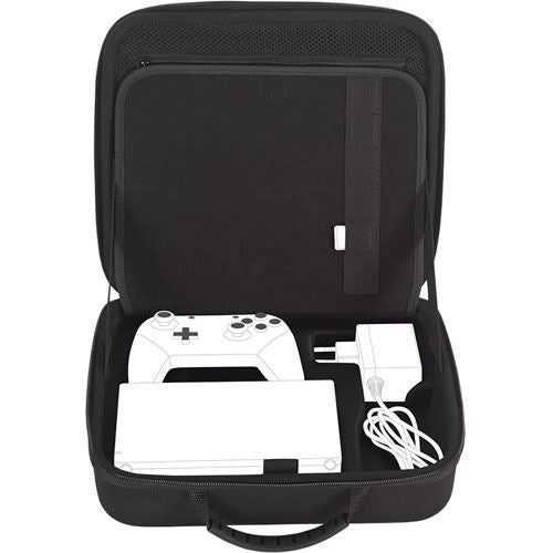 Mala de transporte rígida para a NINTENDO Switch ™, docking station e acessórios. Slots dedicados para a consola, controlador PRO ou Joy-Con, adaptador de corrente, docking station e 6 cartões de jogos. Bolsa interior para guardar cabo HDMI e alças para Joy-Con. Cor Preto.