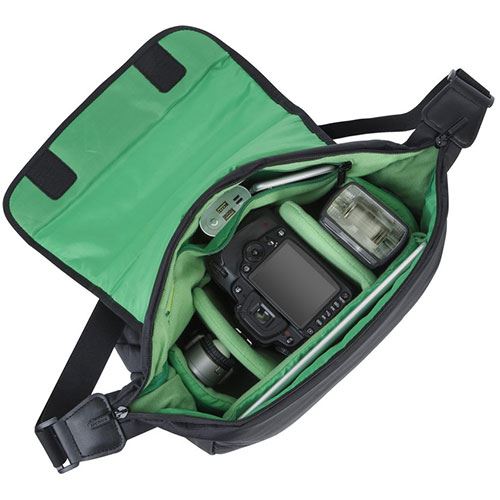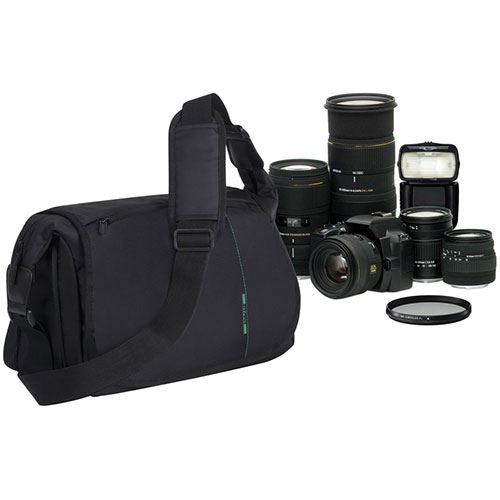 Este saco permite transportar uma câmara SLR com uma objetiva de zoom, bem como uma variedade de outros artigos. Multifuncional e elegante, é perfeita para o viajante que precisa de ser flexível em relação ao que transporta quando está em movimento. Um revestimento interior verde voguish feito de veludo macio protege o ecrã LCD da sua câmara contra riscos e, juntamente com um revestimento exterior simples em preto escuro, expressa uma sensação de elegância e exclusividade.