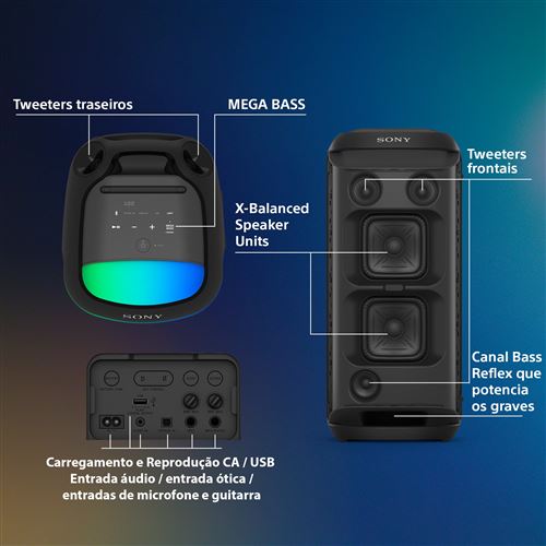 Funções: Streaming Bluetooth / Leitura USB / Karaoke | Codecs suportados: SBC / AAC / LDAC / SCMS-T | À prova de água IPX4 (em posição vertical) / IPX2 (em posição horizontal) | Efeitos luminosos | Carregamento rápido | Clear Audio+ | MEGA BASS | DSEE / L