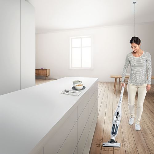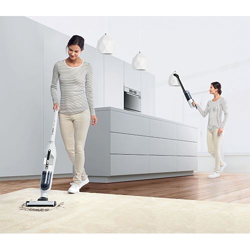 Prático, rápido e potente. Com os acessórios integrados para maior conforto e flexibilidade na limpeza diária | 2 em 1: aspirador vertical e aspirador de mão | 2 níveis de potência | Fácil remoção e esvaziamento do depósito | Easy Clean System: fácil remoção e limpeza da escova | Máxima flexibilidade: aspiração sem limites mesmo em locais mais difíceis (tais como em torno e sob móveis e cantos), graças ao facto de não ter fio e à junta do bocal extremamente flexível | Mantem-se em pé, sem suport