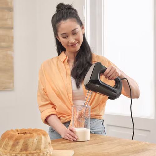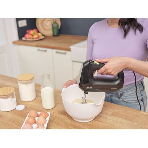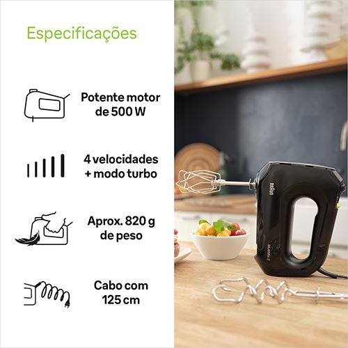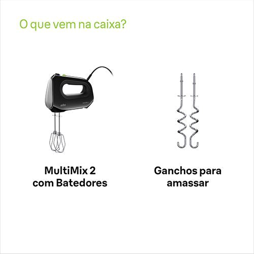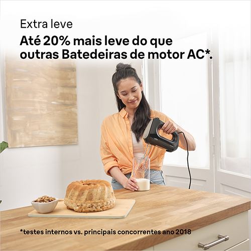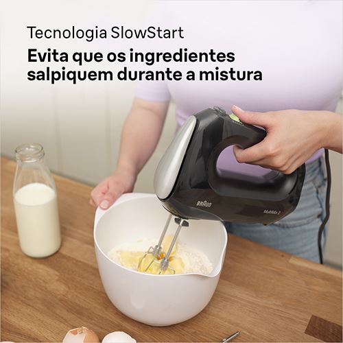 Até 20% mais leve do que as batedeiras com motor de corrente alterna*, a nova MultiMix 2 combina a simplicidade com um potente motor de corrente contínua de 500 W e uma elegante placa frontal de metal que dá um toque de design. E graças à tecnologia SlowStart que evita salpicos sujos, pode criar massas e cremes sem ter de limpar a bancada (* Testes internos da unidade de motor de corrente contínua da Braun em comparação com os principais concorrentes com motores de corrente alterna - ano 2022).