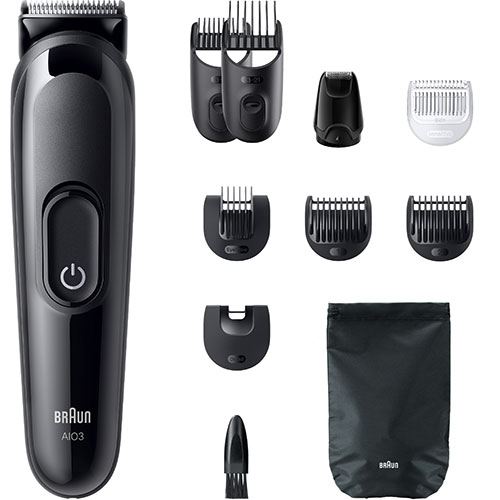 Kit de Cuidados Pessoais All-in-One da Braun para homens. O Kit de Ferramentas 10 em 1 permite aparar facilmente o rosto e o cabelo. Obtenha precisão e eficiência confortavelmente em pouco tempo com a Lâmina Ultra Afiada. Mantenha o controle total do cuidado pessoal com 14 configurações de comprimento. Inclui cabeças e pentes laváveis e uma escova de limpeza para uma limpeza rápida e sem esforço. Braun AIO Série 3, construído para durar, tempo de funcionamento de 50 minutos.Conteúdo da caixa: 1 aparador, 7 pentes, 1 acessório, 1 escova de limpeza, 1 bolsa.