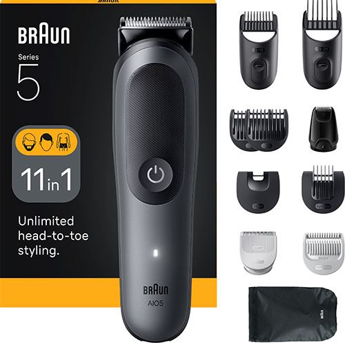 Kit de Cuidado Multifuncional da Braun para homens. O Kit de Ferramentas 11 em 1 permite que apare facilmente a sua barba, orelhas, nariz, corte o seu cabelo e cuide do corpo inteiro. Obtenha confortavelmente precisão e eficiência com a Lâmina Ultra Afiada. Apare o corpo com segurança e perfeição com a tecnologia SensitiveTrim. 14 configurações de comprimento e AquaGrip para uso debaixo de água dão-lhe total controle do cuidado pessoal. A Braun AIO Série 5 é construída para durar, à prova d'água e com até 120 minutos de autonomia com bateria de Li-Ion.Conteúdo da caixa: 1 aparador, 8 pentes, 1 acessório, 1 escova de limpeza, 1 bolsa.