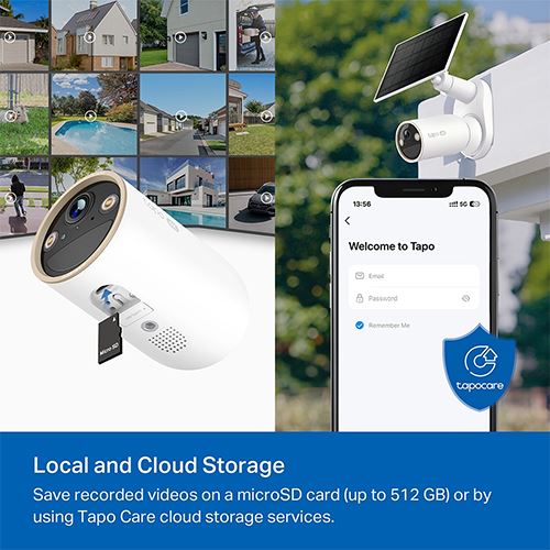 Opções de Armazenamento Flexíveis: Escolha entre armazenamento local em cartão microSD até 512 GB ou o seguro serviço em nuvem Tapo Care para maior tranquilidade.