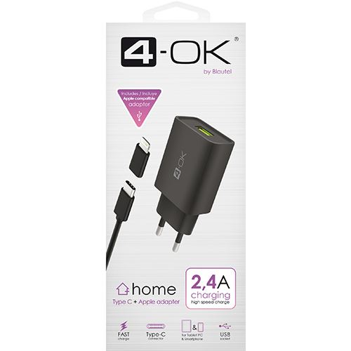 Carregador 4-OK 2.4A USB para USB-C + Adaptador USB-C para Lightning