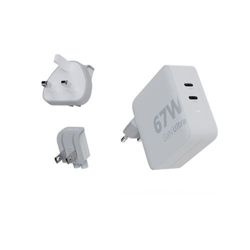 O nosso carregador de viagem GaN Ultra de 67 W é perfeito para as suas viagens, escritório ou casa. A inclusão de duas portas USB-C PD garante a compatibilidade com uma vasta gama de dispositivos. A porta USB-C PD de 67 W proporciona um carregamento de alta velocidade para os mais recentes smartphones, tablets e computadores portáteis USB-C. Não precisa de quaisquer adaptadores ou cabos adicionais; basta ligar e carregar.
