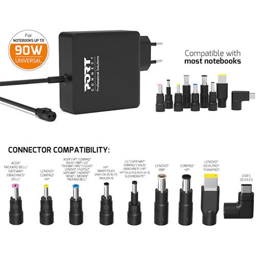 O Port Connect 90W Universal é a solução ideal para quem procura um carregador versátil, potente e compatível com uma vasta gama de portáteis até 17''. Equipado com 9 conectores intercambiáveis, adapta-se facilmente às principais marcas do mercado, como Lenovo®, Dell®, HP®, Asus®, Toshiba®, MSI®, Acer®, LG®, Fujitsu®, entre outras.