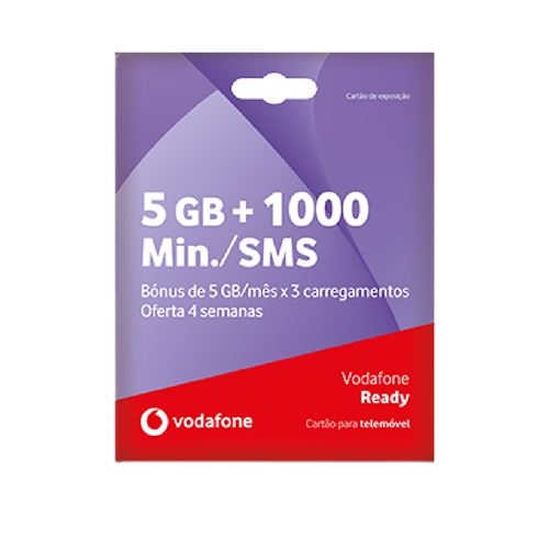 Os 3 bónus extra de 5 GB/mês são válidos para carregamentos iguais ou superiores a €21 nos primeiros 3 meses, desde a ativação do cartão. Limitado a 1 bónus por mês, válido para o tarifário Vodafone Ready nas opções 5 GB e 10 GB. Se preferires outra combinação de dados móveis e min./SMS, podes alterar gratuitamente na App My Vodafone. Vê todas as opções aqui. Caso pretendas manter o teu número, podes fazer um pedido de portabilidade.
