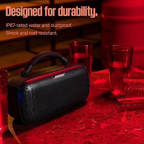Processador Qualcomm Snapdragon Sound | Google Fast Pair | Spotify Tap | Conectividade multiponto | Design robusto - Resistente a choques e ferrugem | Classificação IP67 - À prova de poeira e totalmente submersível em água até até 30 minutos a uma profundidade de 1 m (3,3 pés) | Deteção de humidade no conetor | Alça de transporte ao obro vendida separadamente | Desligar automático ajustável a partir da aplicação aplicação Bose. A predefinição é 20 minutos quando não está a ser reproduzido áudio