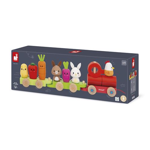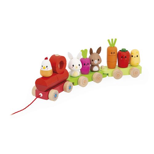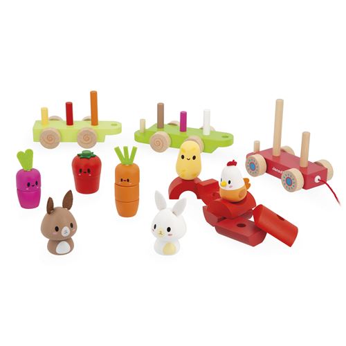 Abram caminho para o pequeno comboio da quinta com os seus vegetais e pequenos animais! Atraente trem de madeira com 3 carruagens e 19 peças para montar para criar legumes da horta (batata, tomate, cenoura e rabanete) e animais da fazenda (coelhos e galinha). Esta atividade irá desenvolver habilidades motoras finas em crianças muito pequenas, enquanto as mais velhas podem desenvolver suas habilidades motoras grossas levando o comboio para uma caminhada ao usar a corda.
