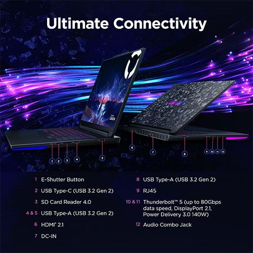 2x USB 3.2 Gen 1 | 1x USB-C DisplayPort 2.1 | 1x Thunderbolt 4 | 1x HDMI 2.1 | 1x RJ-45 | 1x Jakc 3.5mm (combo)