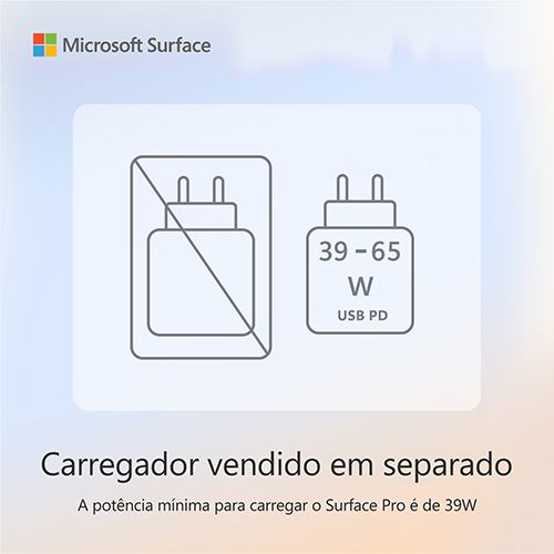 Para suportar as iniciativas de sustentabilidade destinadas a reduzir resíduos eletrónicos, a fonte de alimentação é agora vendida separadamente. A potência mínima necessária para carregar o Surface Pro (11th Edition) é 39 W. Para obter mais informações, visite