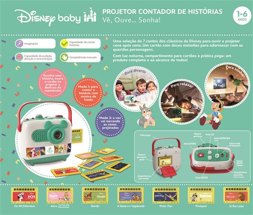 Um contador de histórias inovador com projeção de imagens para envolver os mais pequenos no mundo mágico dos clássicos da Disney enquanto ouvem as histórias. O projetor inclui oito cartões: um para dormir e os outros com histórias famosas da Disney: Bambi, Pinóquio, Peter Pan, A Dama e o Vagabundo, Alice no País das Maravilhas, Os 101 Dálmatas, O Rei Leão.