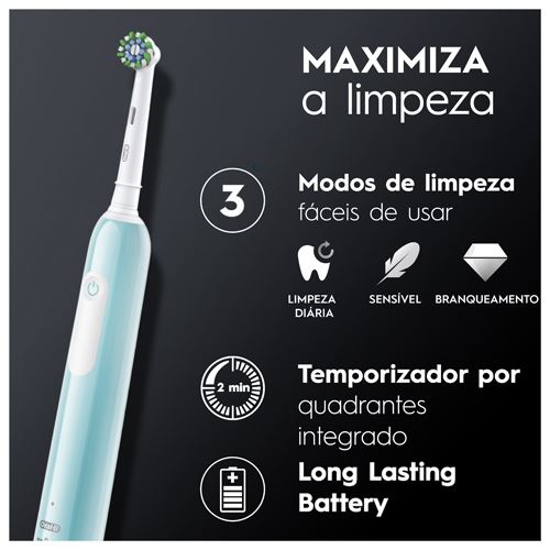 Sensação de limpeza profissional todos os dias e escovagem suave com controlo de pressão nas gengivas. A tecnologia de limpeza 3D exclusiva da Oral-B: oscila, roda e pulsa para uma remoção de até 100% mais placa bacteriana mesmo em áreas de difícil acesso em comparação com uma escova de dentes manual. Controlo de pressão das gengivas: se escovar com demasiada força, a escova de dentes interrompe as pulsações para proteger as gengivas. A recarga de escova redonda inspirada pelos dentistas adapta-se a cada dente para uma limpeza profunda e é suave para as gengivas. Escova de dentes recarregável com bateria de longa duração e indicador de nível da bateria. A cabeça da escova da Oral-B desvanece de verde para amarelo com base na utilização individual, indicando quando é altura de mudar, para manter uma eficácia de limpeza de 100 %. Conteúdo: 2 cabos com temporizador de 2 minutos, 1 carregador, 2 recargas de escova de dentes. Oral-B é a marca n.º 1 mais usada por dentistas em todo o mundo com resultados clinicamente comprovados