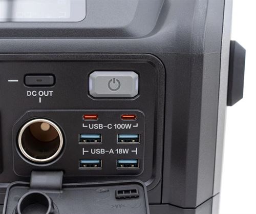 Interfaces 1x Entrada CA (230V~50Hz, 1250W máx.) | 1x Entrada isqueiro automóvel (12V/24V, 200W máx.) | 1x Entrada Painel solar (12-60V, 800W máx.) | 3x Saída CA (230V~, 9,56A, 50Hz, 2200W máx) | 1x Saída isqueiro automóvel (13, 6V, 10A, 136W máx.) | 2x Saída DC5525 (13.6V, 5A, 68W máx.) | 2x Saída USB-C (5/9/12/15/20V, 5A, 100W máx.) | 4x Saída USB-A (5/9/12V, 3A, 18W máx) | Potência máxima de saída DC: 384 W | Função MPPT (Maximum Power Point Tracking) de entrada DC
