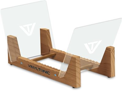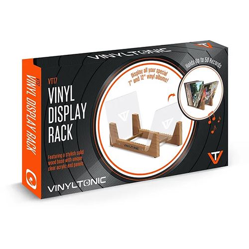 O expositor Vinyl Tonic apresenta uma elegante base em madeira maciça com painéis laterais exclusivos em acrílico transparente para expor todos os seus álbuns especiais em vinil de 7” e 12”.