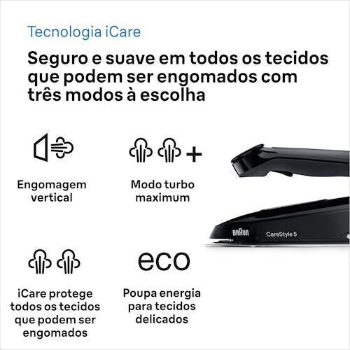 Melhore a sua rotina de engomagem e poupe tempo para o que realmente importa. O novo CareStyle 5 da Braun é ultra-potente - produz até 150 g/min graças à inovadora tecnologia PowerSteam. Experimente resultados de engomar, mesmo nos vincos mais difíceis.