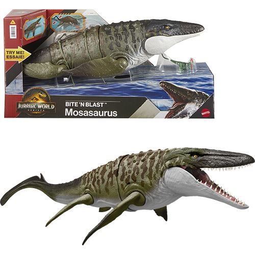 Este Dinausauro do Mar da "SAGA Jurassic" é um vilão velho conhecido de outros filmes, e faz ataques laterais. Mede aproximadamente 65 cm de comprimento! Ele vem equipado com as funções "Bite N Blast", de mordida e regurgito, além de nadadeiras e cauda articuladas.