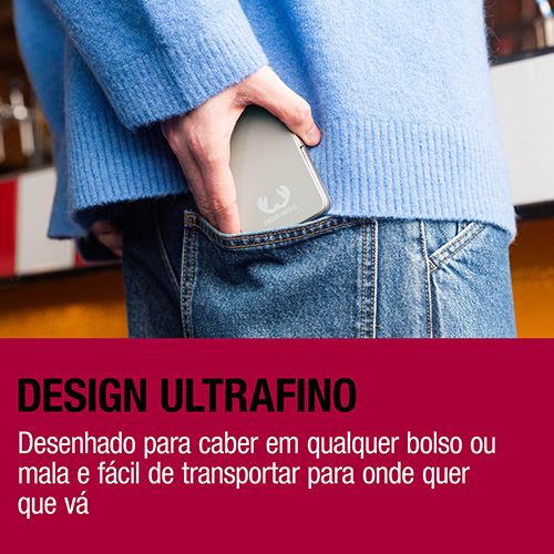 O design ultrafino e leve do Powerbank torna-o super fácil de transportar para qualquer lugar. Graças às suas células de bateria inovadoras, é feito para caber em qualquer bolso ou mala. Mesmo quando conectado ao teu iPhone.