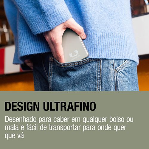 O design ultrafino e leve do Powerbank torna-o super fácil de transportar para qualquer lugar. Graças às suas células de bateria inovadoras, é feito para caber em qualquer bolso ou mala. Mesmo quando conectado ao teu iPhone.