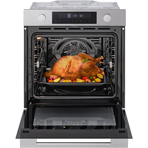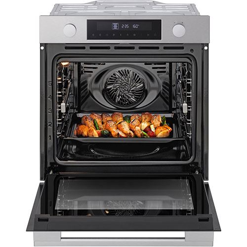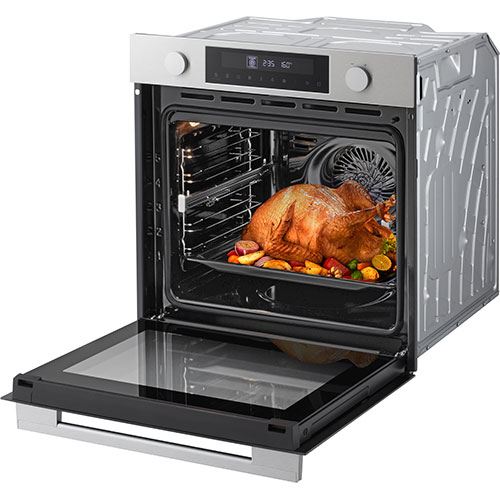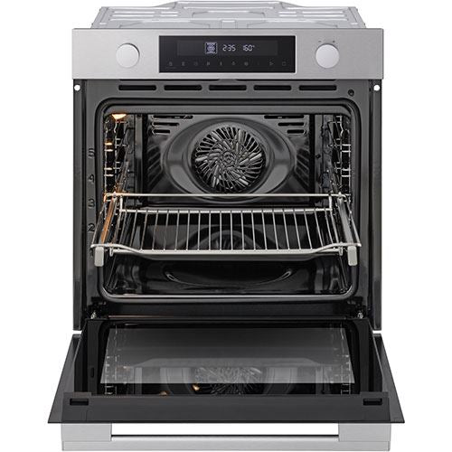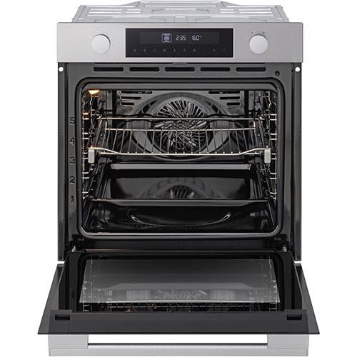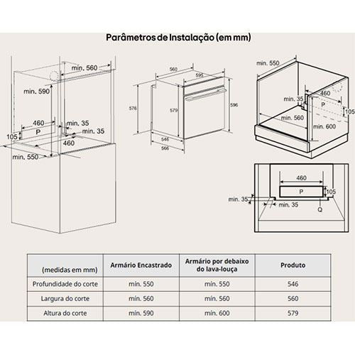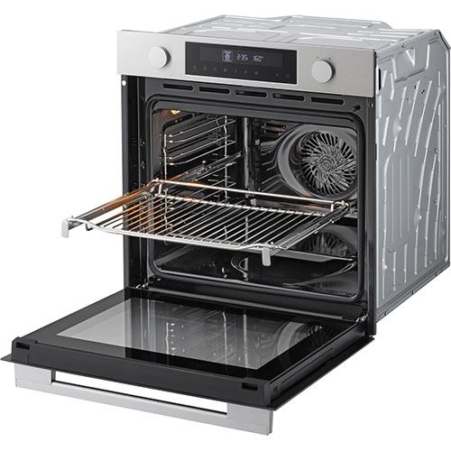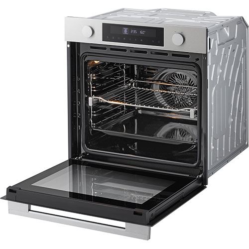 O design moderno em aço inoxidável com interior em esmalte cinza escuro combina elegância e durabilidade. Conta com controlo intuitivo por ecrã tátil e dois botões analógicos, iluminação halogénea e porta com 4 vidros para maior segurança. A temperatura varia entre 30°C e 250°C, com desligamento automático após 9 horas.