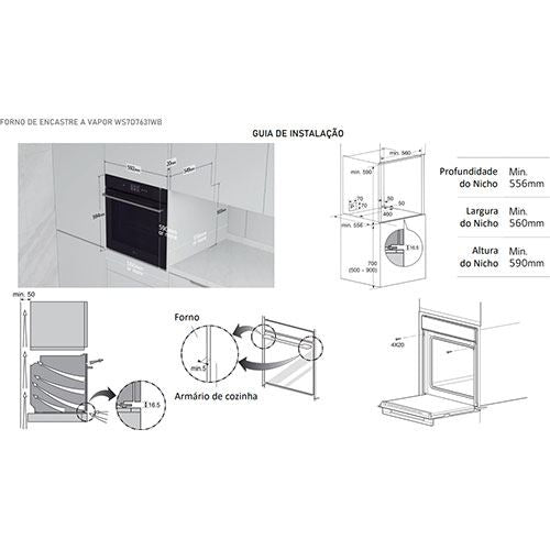 Controlo: Ecrã LCD 4.3” com roda de comando | Iluminação: LED | Níveis de colocação para tabuleiro ou grelha: 5 | Sonda de temperatura