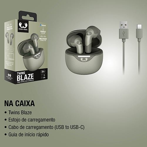 Embalagem Twins Blaze | Caixa de carregamento | Cabo de carregamento (USB-C para USB-C) | Guia rápido