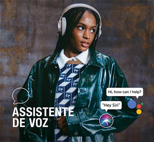Clica três vezes no botão do meio do auscultador direito para ativar o assistente de voz do teu dispositivo (Siri ou Google Assistant). Utiliza os comandos vocais para controlar o teu som e as tuas chamadas em modo mãos-livres.